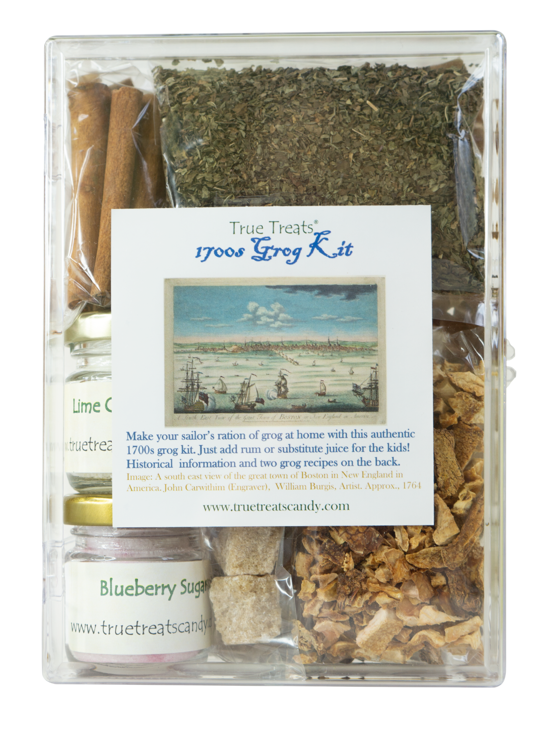 A truly historical drink as popular as it was controversial! This do-it-yourself kit contains common makings of grog, a popular drink in the 18th and 19th century for sailors on ships and revelers on shore. This kit contains two popular recipes and common ingredients used throughout time, such as cinnamon sticks, cut sugar, fruit sugar, spearmint tea, lemon peel tea, and lime crystals. Just add the rum and you’re good to go! One early iteration was rum and water, period. Our advice: use the recipes instead. Want to improvise? Feel free. You can dress up grog with mint leaves or serve it on the rocks.